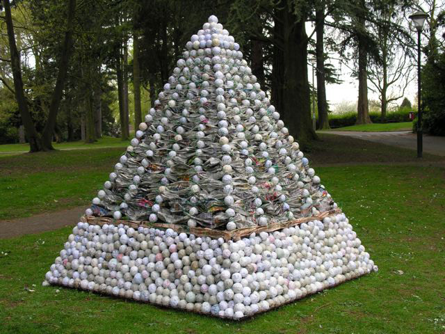 This pyramid, called ‘Formal Dress’, is the result of many small gestures made by a lot of people. Small, medium and large hands of all ages have made one paper snowball…and the pile keeps growing for future projects! For the ruching, it was decided that ‘up-cycled’ Guardian newspapers would be a suitable choice complementing the snowballs and also a salute to Stroud’s green social history.